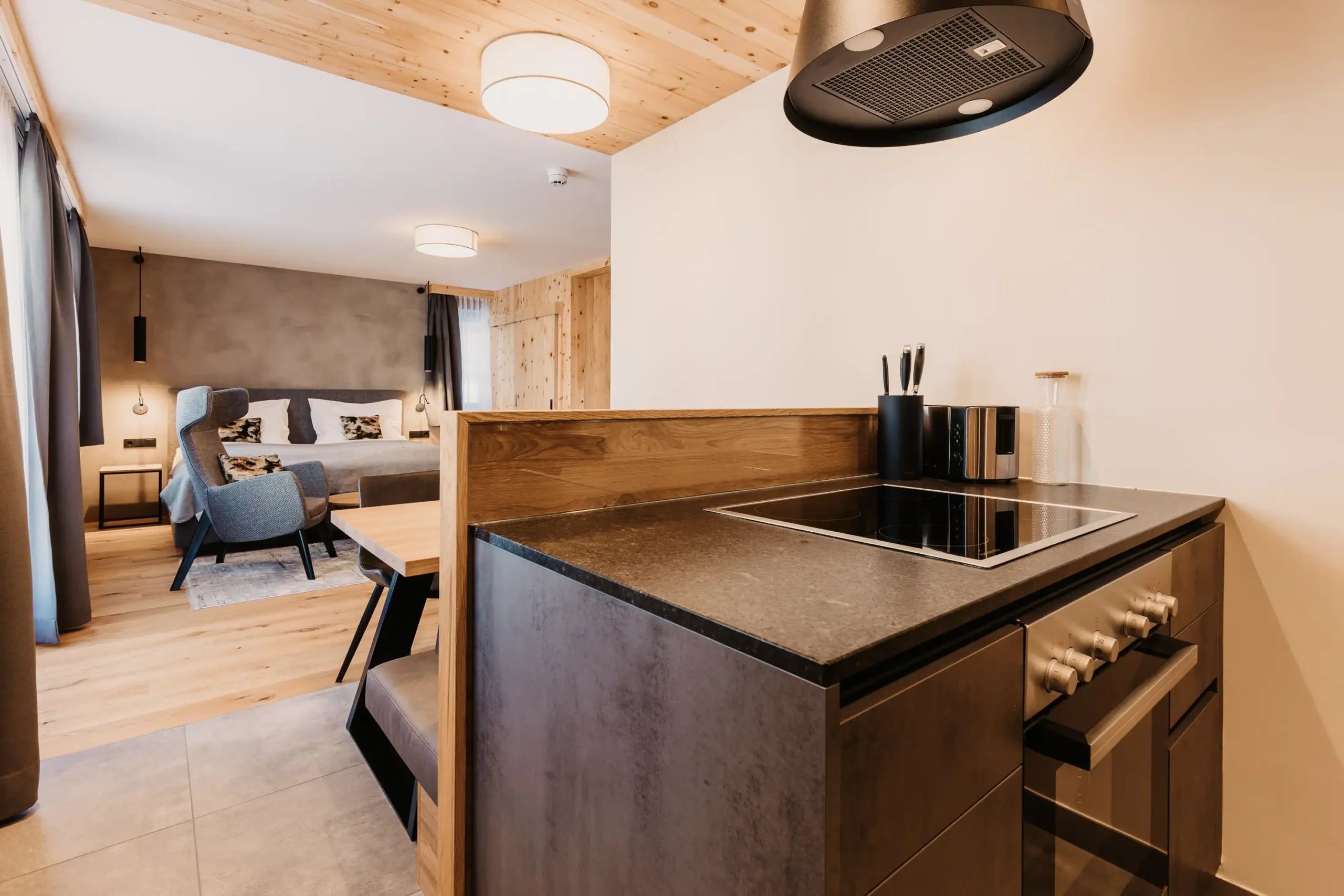 The modern, fully equipped kitchen/living room and cosy beds invite 2 adults and 2 children to stay and relax. The studio apartments are 45²m in size, north-, mountain- and street-facing and therefore ideal for enjoying the afternoon sun. In addition to free Wi-Fi, Flat TV and Smart View in all living and sleeping rooms, a balcony with seating area is available.